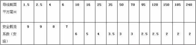 口訣(一)導(dǎo)線截面安全電流系數(shù)表: