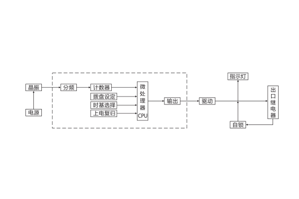 SJ-11A/11集成電路時間繼電器采用大規(guī)模CMOS專用集成電路。上電瞬間,晶振起振, CUP復位,從零開始正向計數(shù),同時讀取撥盤設(shè)定值的時基常數(shù);當計數(shù)值與設(shè)定值同時,輸出高電平,驅(qū)動三極管,出口繼電器動作,且利用觸點自保持,以保證不發(fā)生抖動;當電源消失,出口繼電器則返回,工作原理如下圖所示: